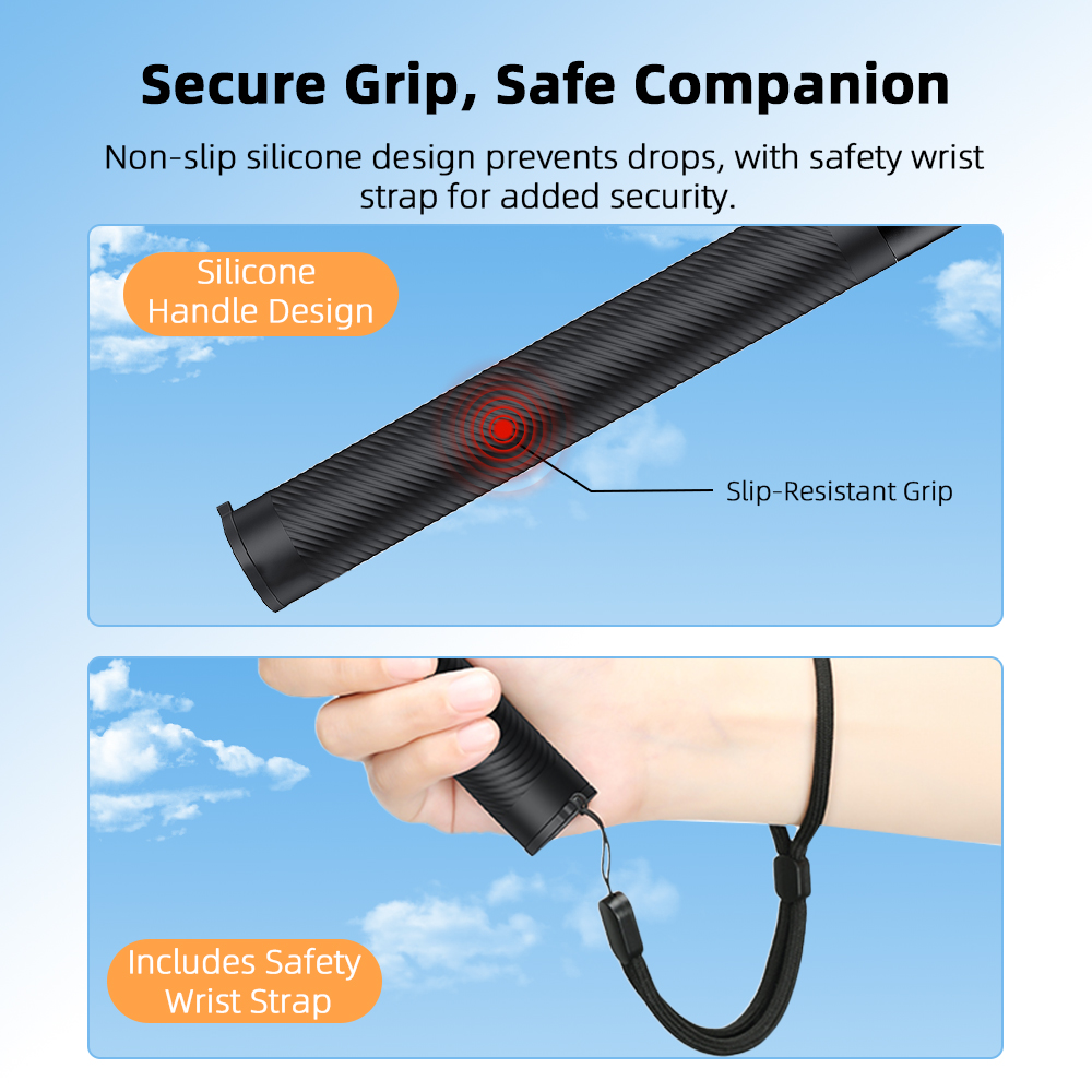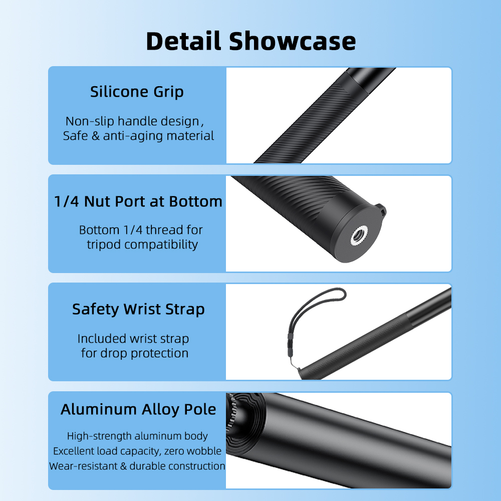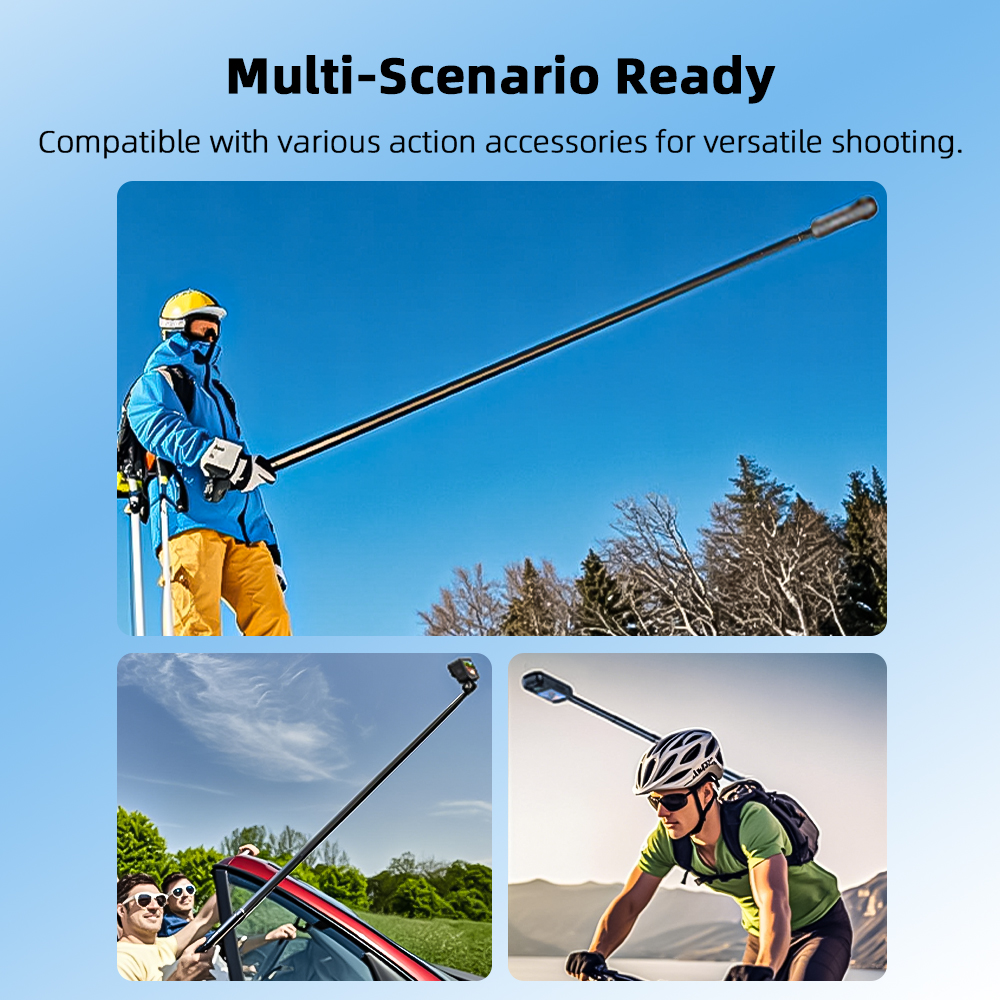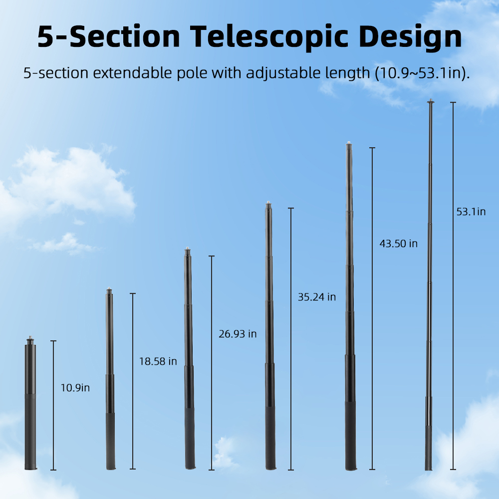 Invisible selfie stick effect5-section telescopic, adjustable lengthStandard 1/4 inch screw interfaceHigh damping for stable supportLightweight design, easy to carrySuitable for various sports scenes