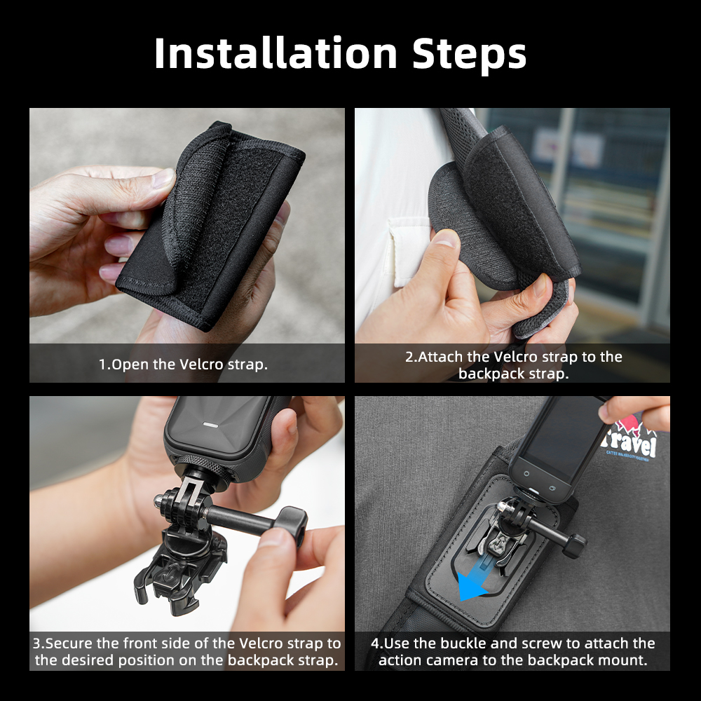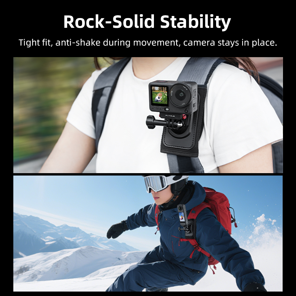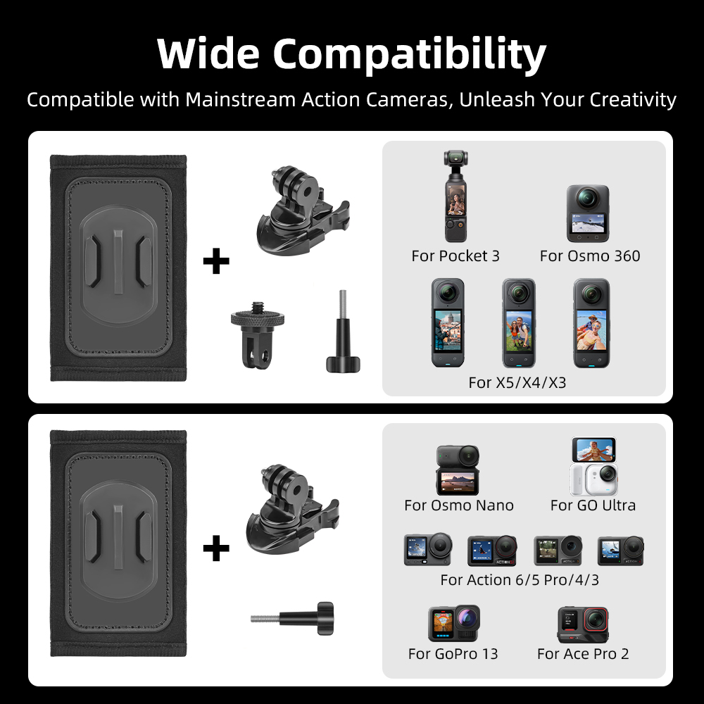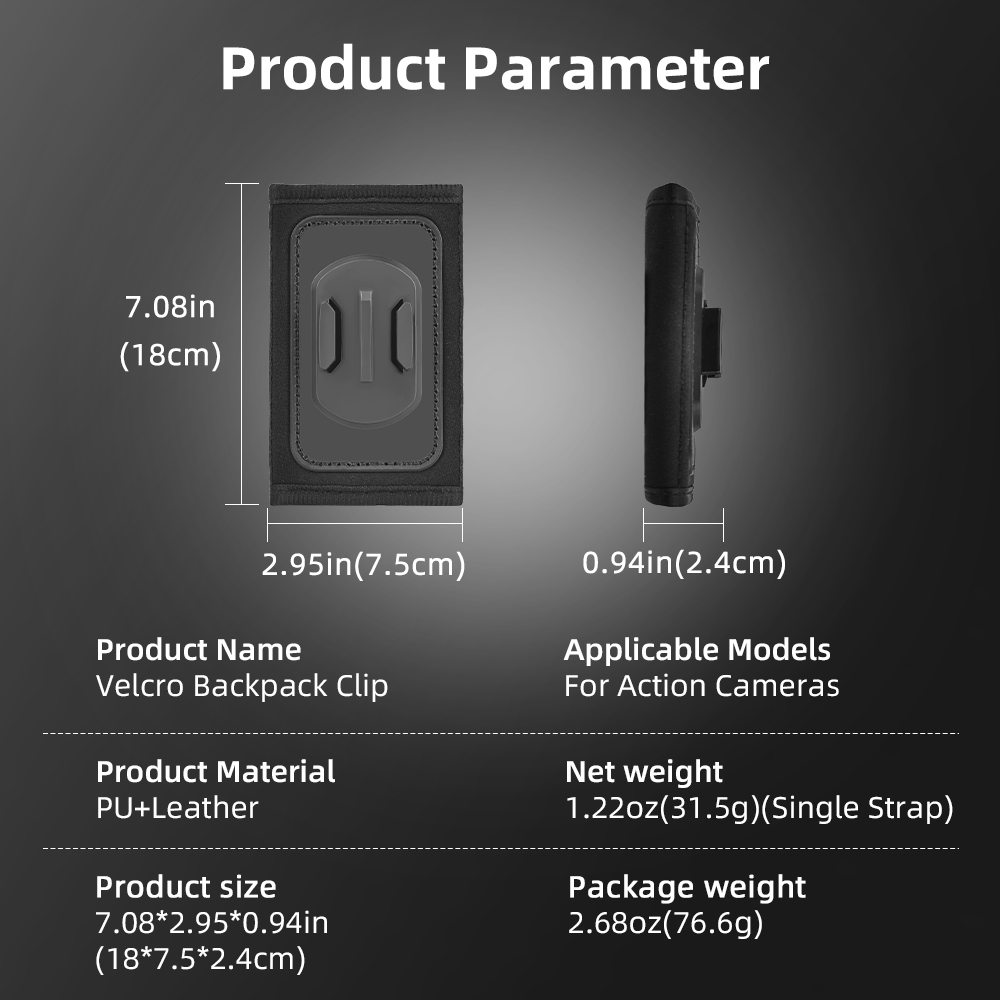 Feature: 1.Stable & Reliable – Tight fit, anti-shake during movement, camera stays in place. 2.Quick-Release System – Secures in seconds, detaches instantly. 3.360° Free Rotation – Fits any backpack. 4.Multi-Mount Compatibility – Works in various positions for flexible, unrestricted shooting. 5.Sealed Seams – Closed stitching for a firm, no-wobble hold. 6.Unique Dual Anti-Slip Design – T-shaped silicone grip granules combined with PU leather for enhanced stability. 7.Residue-Free Adhesion – Strong bond with Velcro backing for extra grip without damaging backpack straps. 8.Wide Compatibility – Features a two-prong mount and 1/4" screw interface, compatible with mainstream action cameras to unlock creative potential.