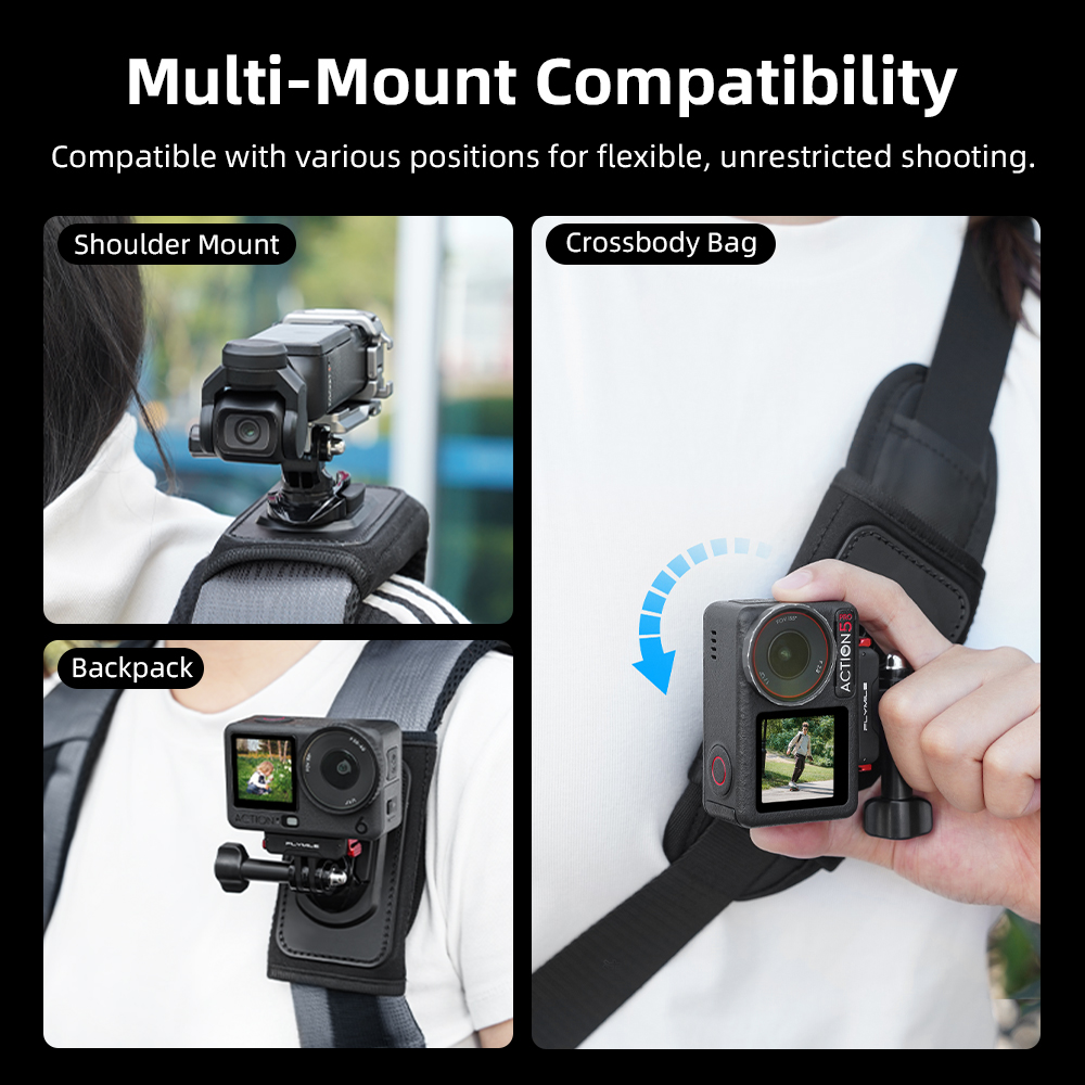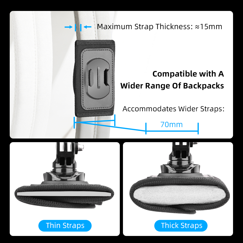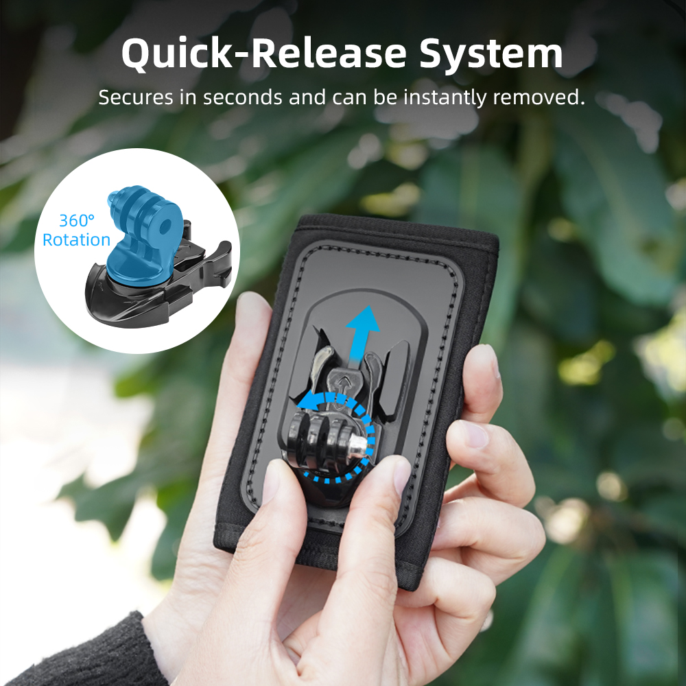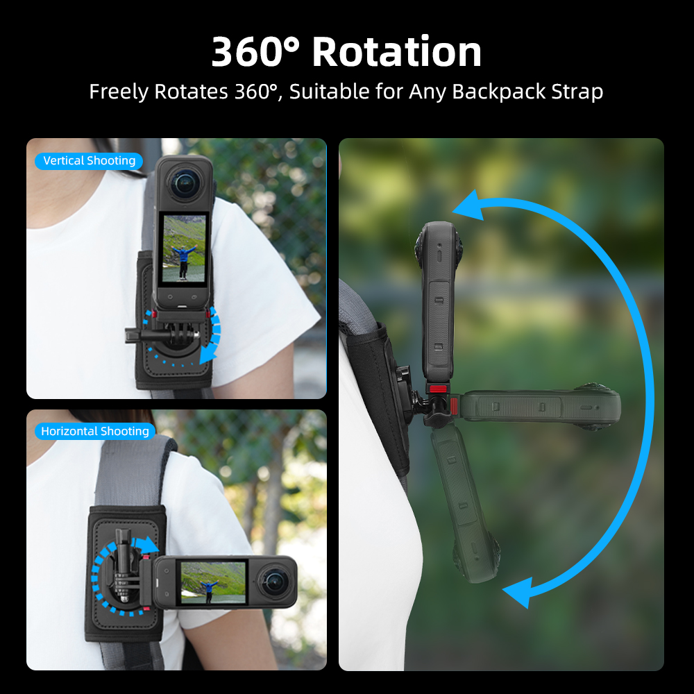Feature: 1.Stable & Reliable – Tight fit, anti-shake during movement, camera stays in place. 2.Quick-Release System – Secures in seconds, detaches instantly. 3.360° Free Rotation – Fits any backpack. 4.Multi-Mount Compatibility – Works in various positions for flexible, unrestricted shooting. 5.Sealed Seams – Closed stitching for a firm, no-wobble hold. 6.Unique Dual Anti-Slip Design – T-shaped silicone grip granules combined with PU leather for enhanced stability. 7.Residue-Free Adhesion – Strong bond with Velcro backing for extra grip without damaging backpack straps. 8.Wide Compatibility – Features a two-prong mount and 1/4" screw interface, compatible with mainstream action cameras to unlock creative potential.