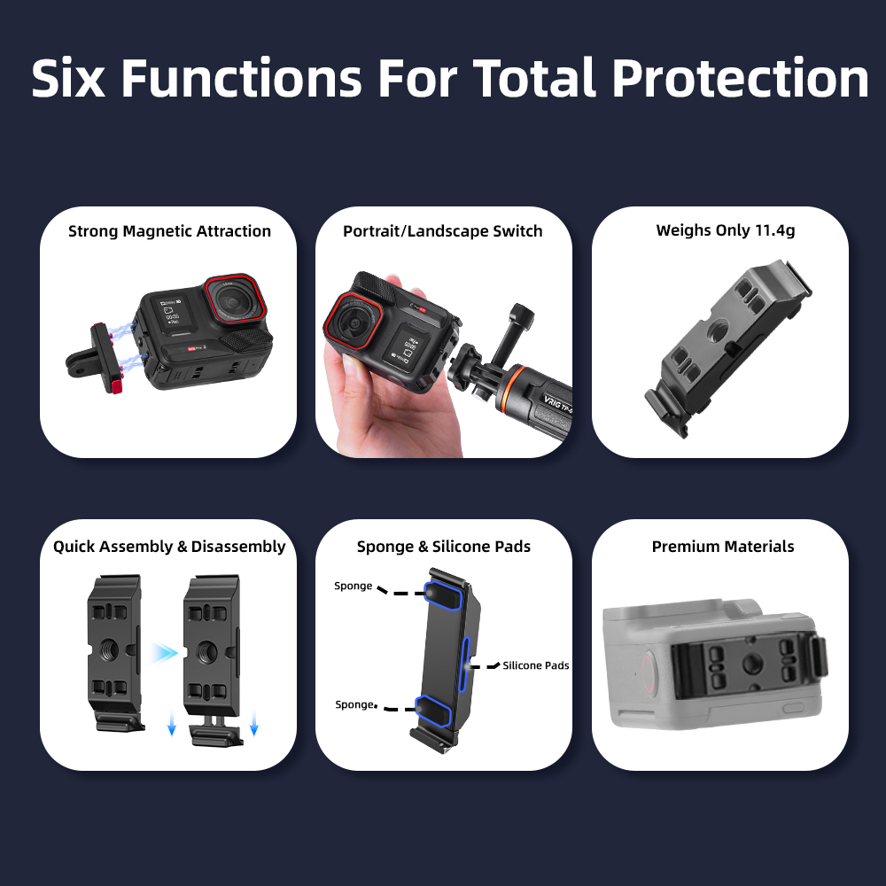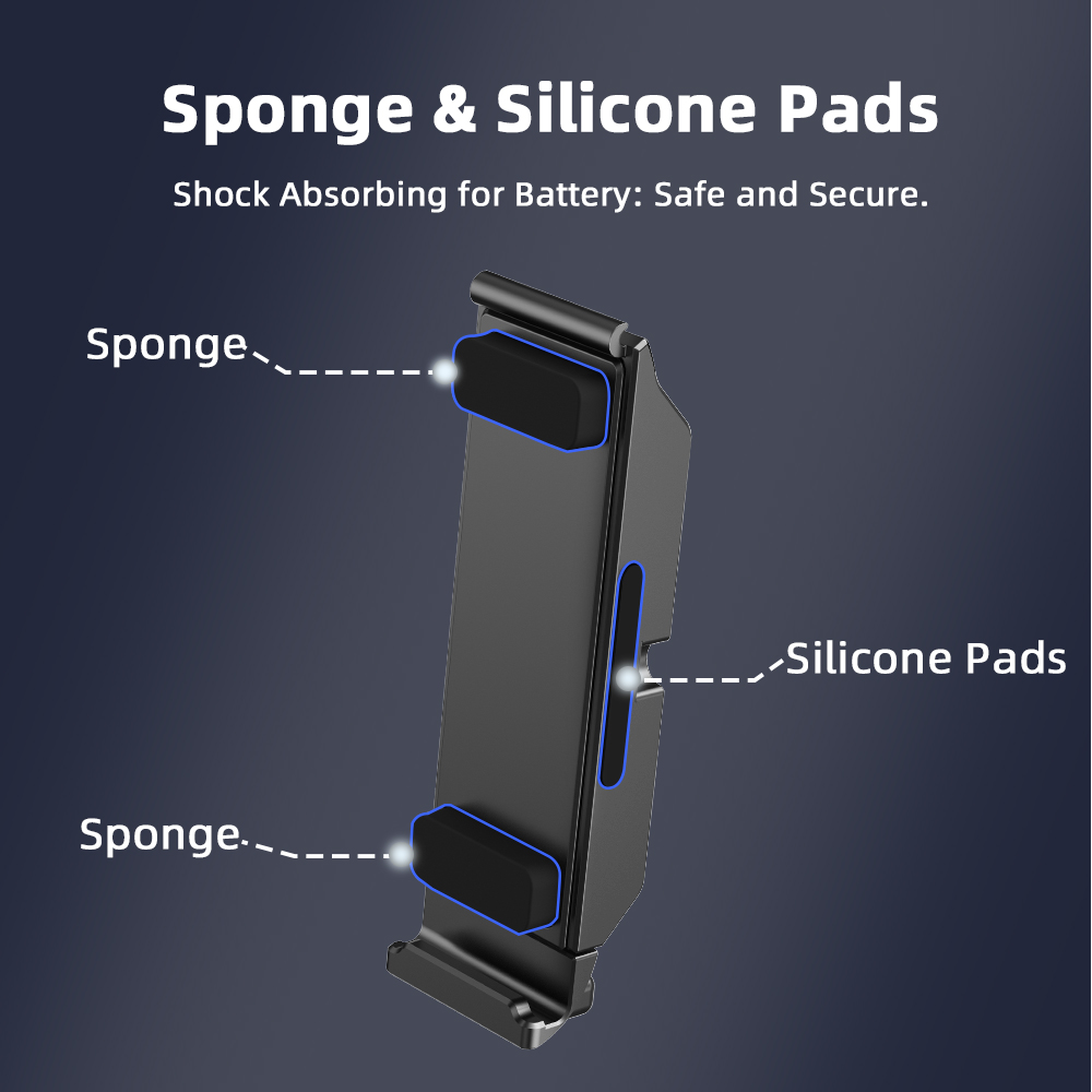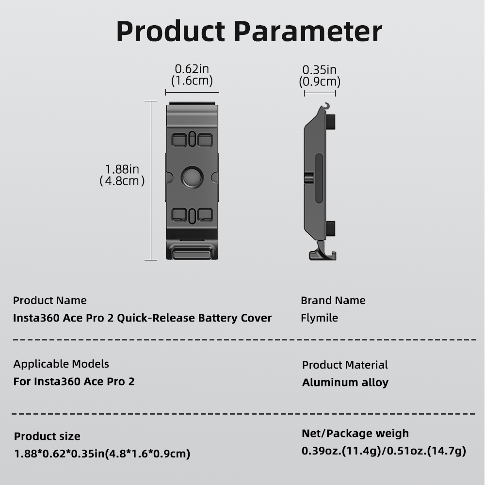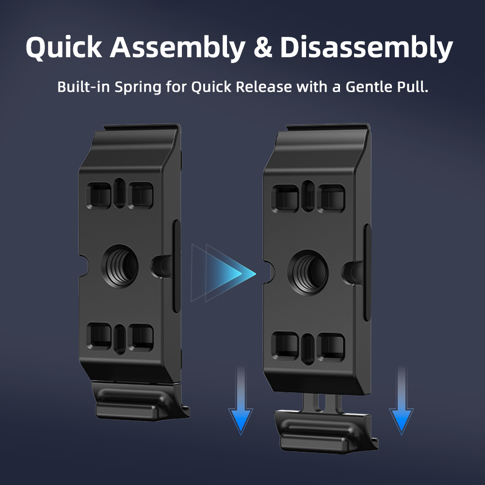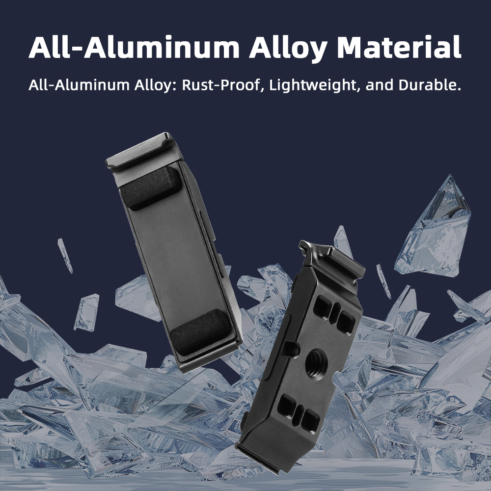 1.Made of full aluminum alloy material, rust-proof and drop-resistant, lightweight yet sturdy; 2.Built-in spring design, a gentle pull allows for quick disassembly; 3.Only weighs 11.4g, compact and lightweight, easy to install without any pressure; 4.Strong magnetic attraction for automatic alignment and locking, allowing for quick switching between horizontal and vertical shooting; 5.Provides shock absorption for batteries, ensuring safety and stability; 6.Enhanced dual interface compatibility with an ACE port and 1/4 screw hole on the battery cover 7.Compatible with Various Magnetic Accessories.