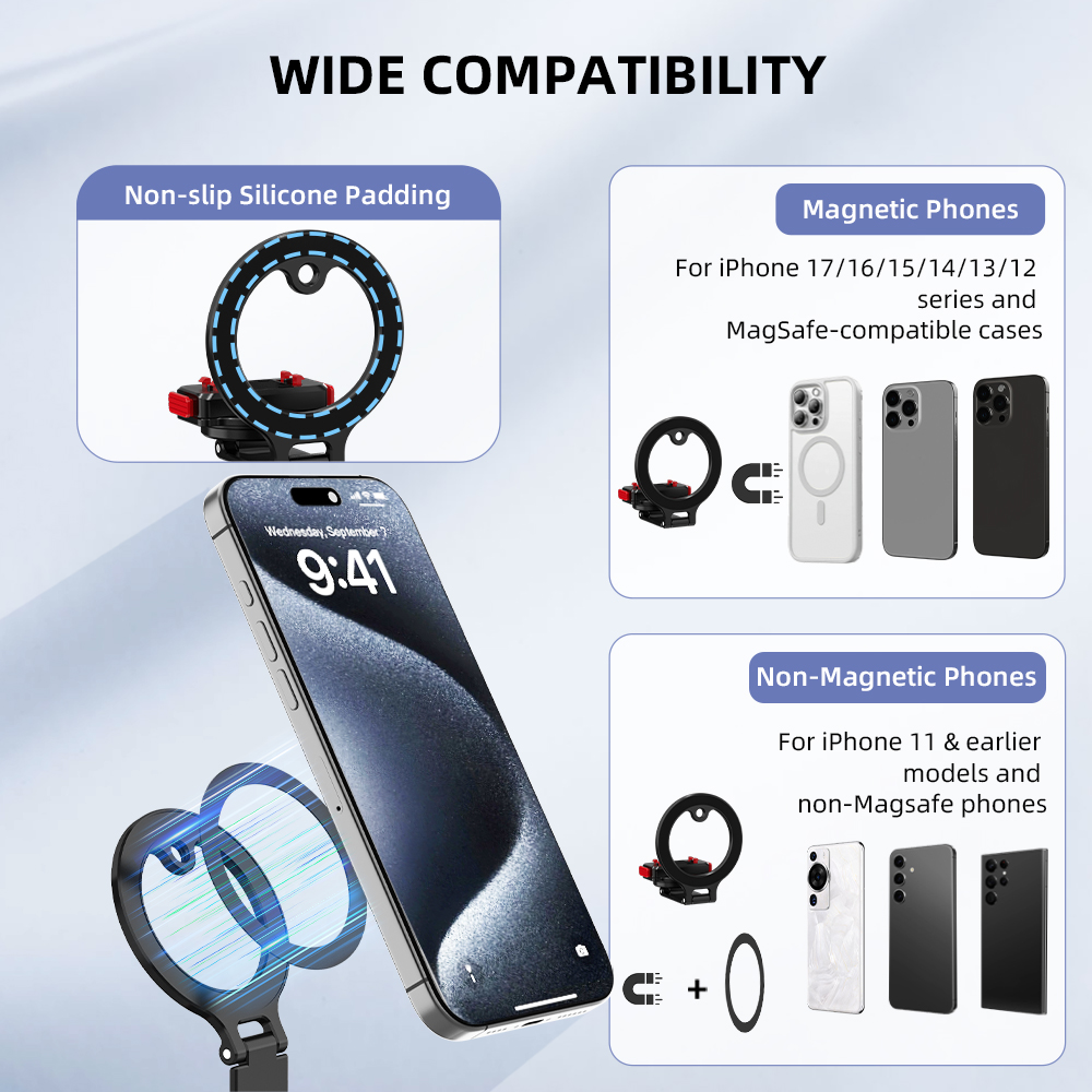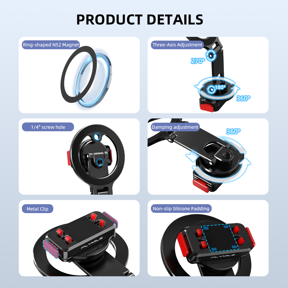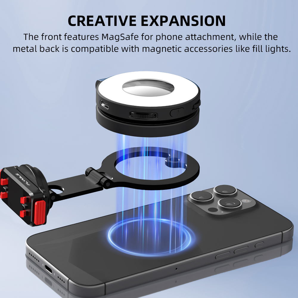 1.Magsafe Extension Magnetic Stand2.Dual-Sided Magnetic Magic3.Action Quick-Release + Strong Magnetic Dual System4.Dual-Camera Shooting5.3-Axis Pivot Structure6.Easily Adapts To Multiple Scenarios7.High-Precision Aluminum Alloy Body