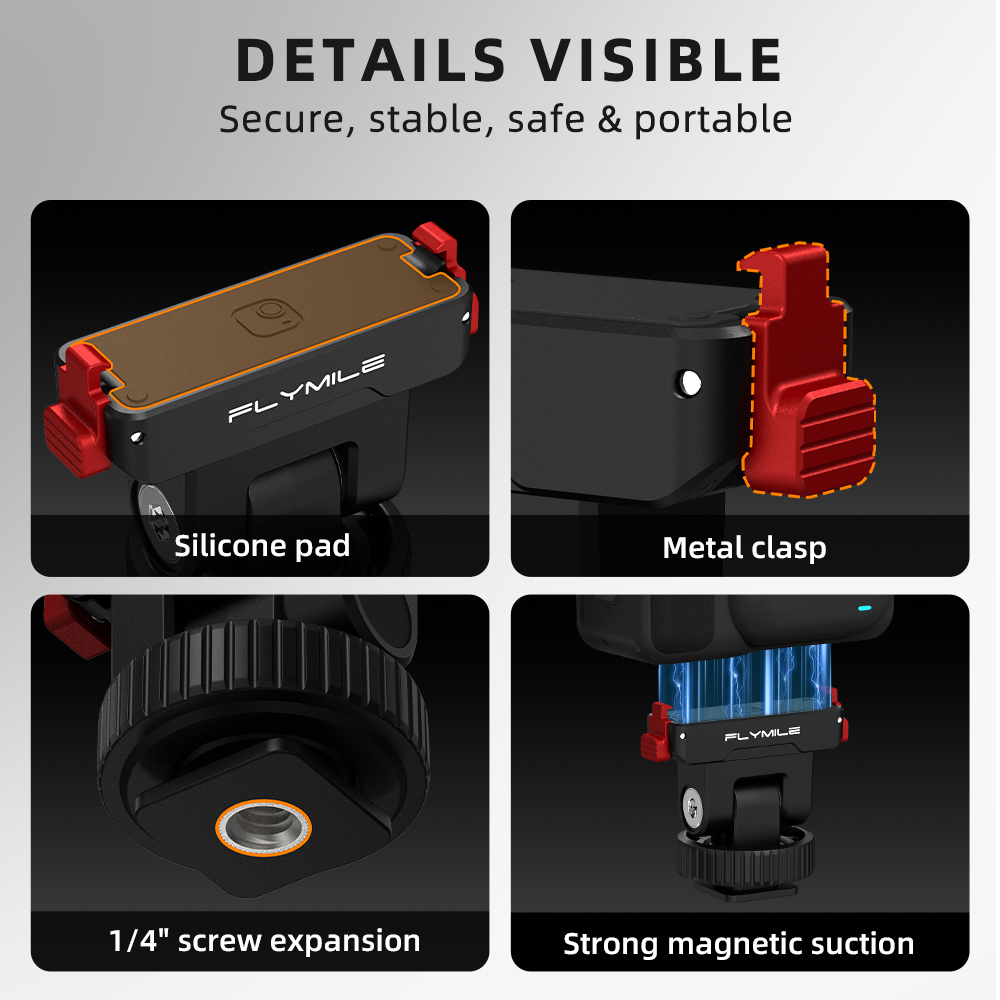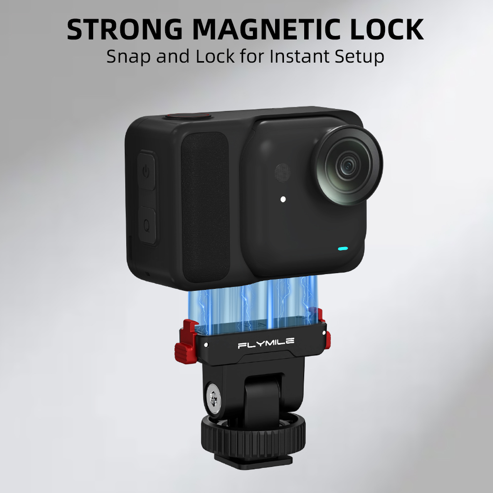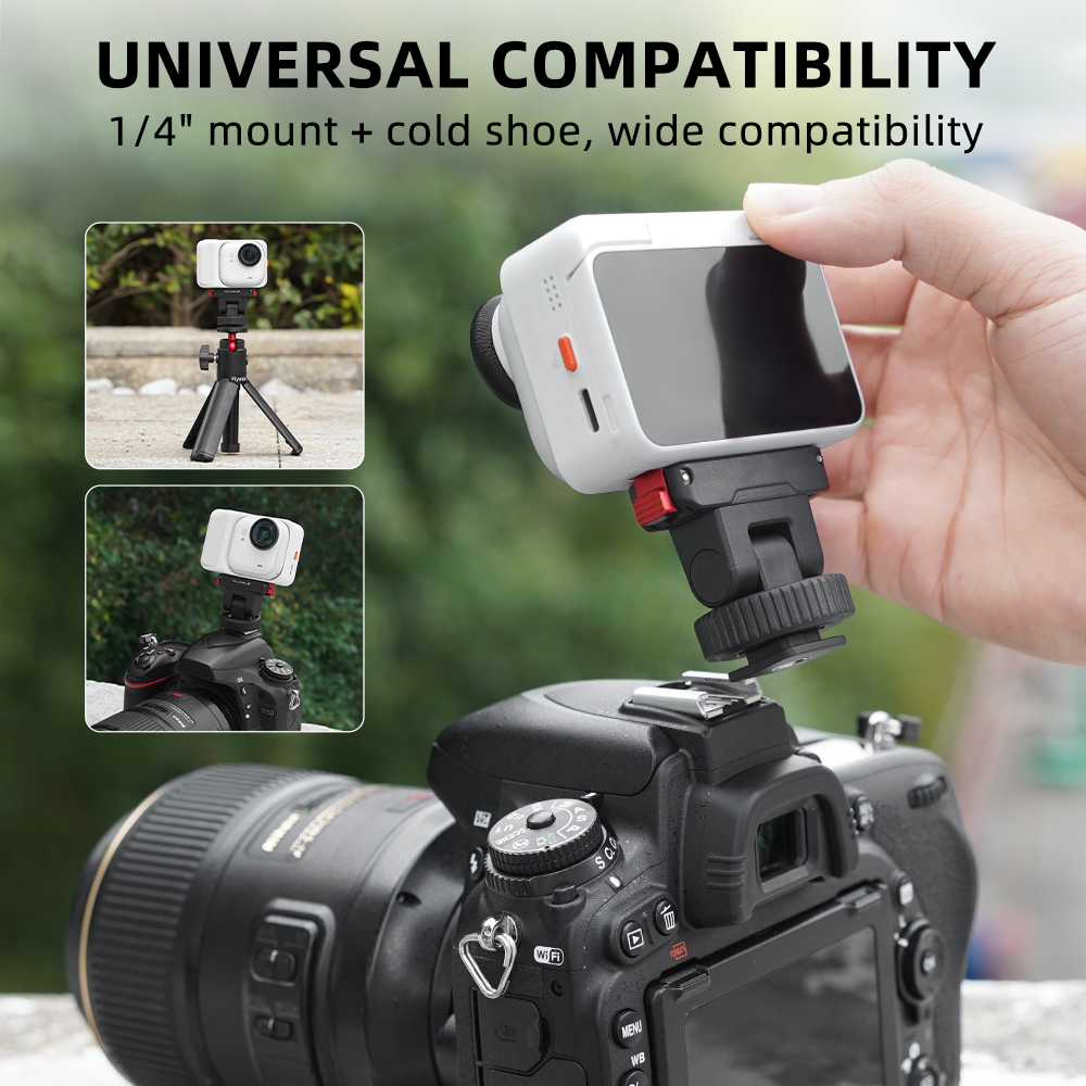 1.Adjustable Viewing Angle,Rotate Freely for Multi-Angle Shooting. 2.Strong Magnetic Lock,Snap and Lock for Instant Setup. 3.Non-Slip Design,Secure Fit with Damping Pad. 4.Durable Metal Construction,Robust Locking Mechanism. 5.Universal Compatibility,1/4" mount + cold shoe, wide compatibility. 6.Lightweight Design,Compact and Portable, 7.Secure Cold Shoe Lock,Engineered for Stable Fastening.