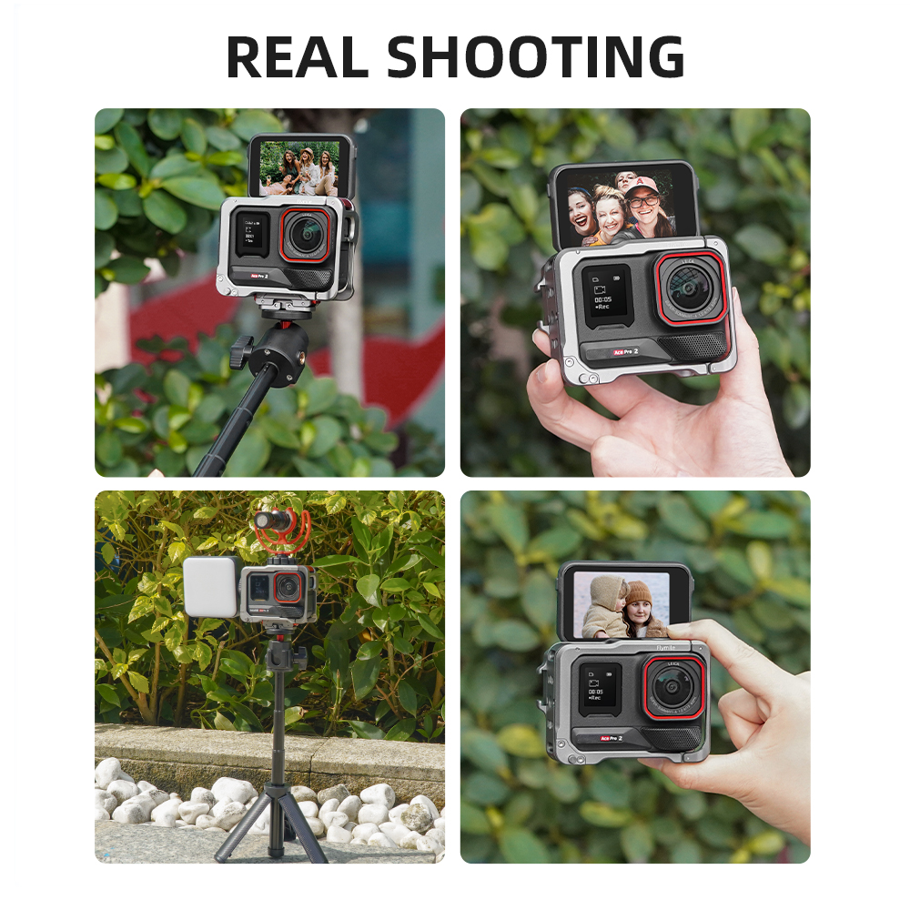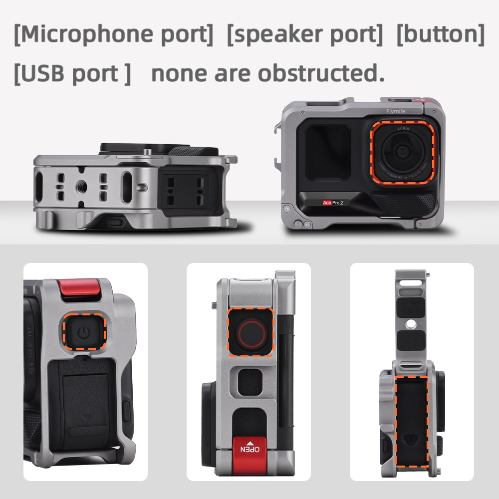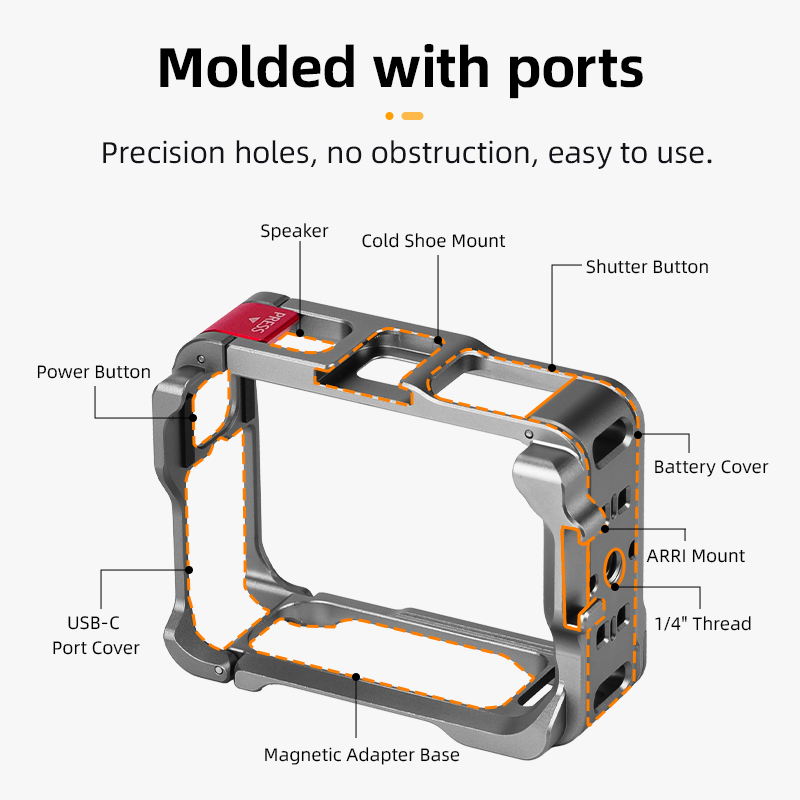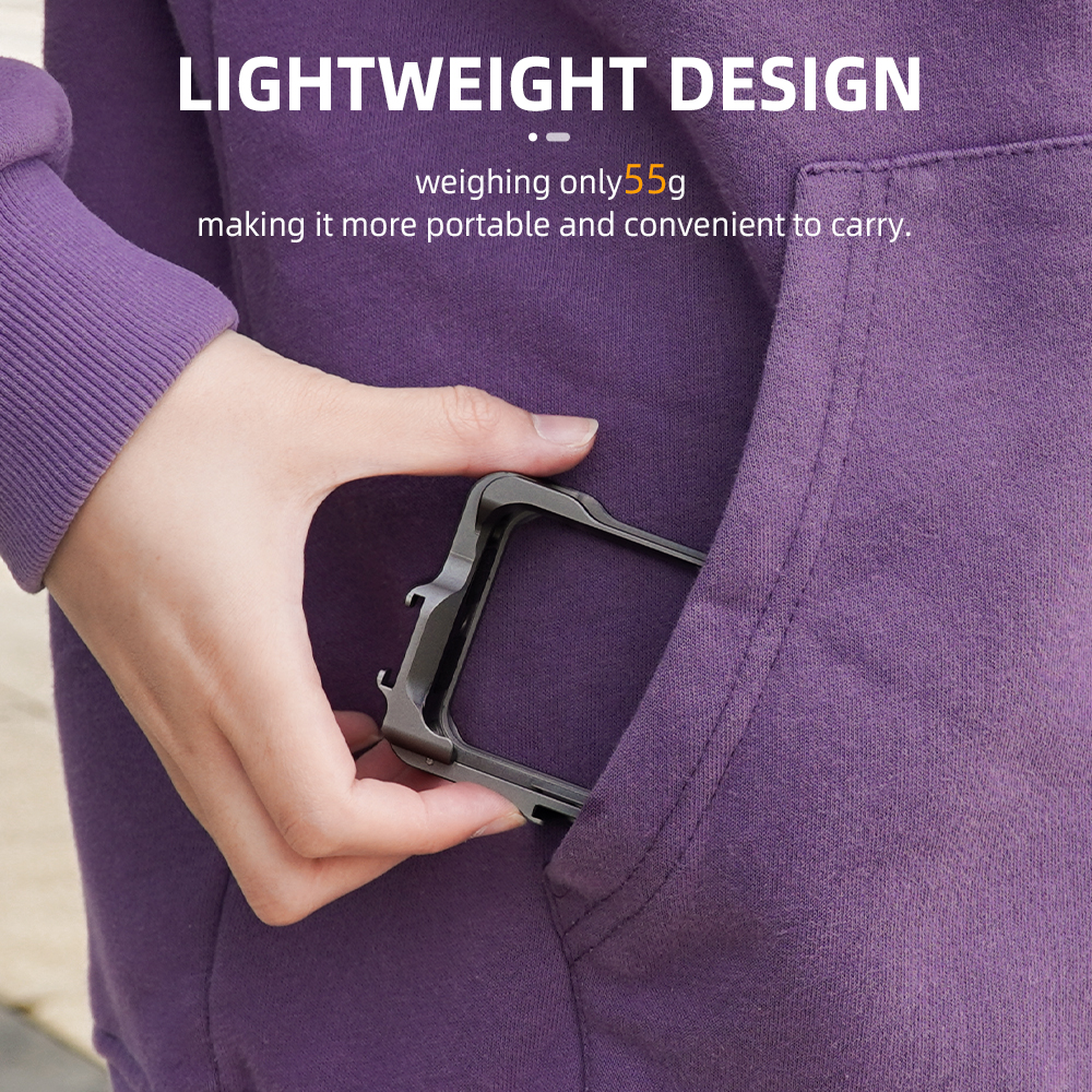 1.The Frame Case is made of aluminum alloy with light weight,The characteristics of high hardness can provide comprehensive protection. 2.Easy to disassemble with just one press. 3.Cold shoe Expansion Interface,Expansion interface for adding lights, microphones, and more creative accessories. 4.The two sides of the aluminum alloy frame box are filled with soft foam, which can hold the camera firmly after installation. 5.The metal cage design accommodates two finger positions, providing ample clearance for the screen to open and close.