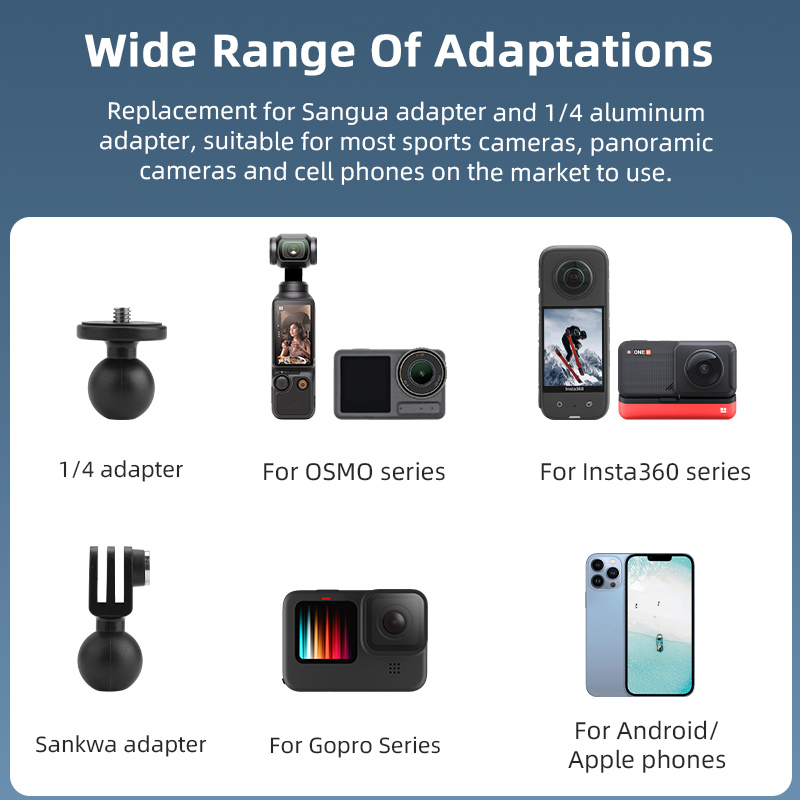 7. Adaptable to most sports cameras and cell phones on the market, such as Pocket 3, Insta360 X3, Insta360 Go3, Gopro, Osmo Action, Phone and other sports cameras,