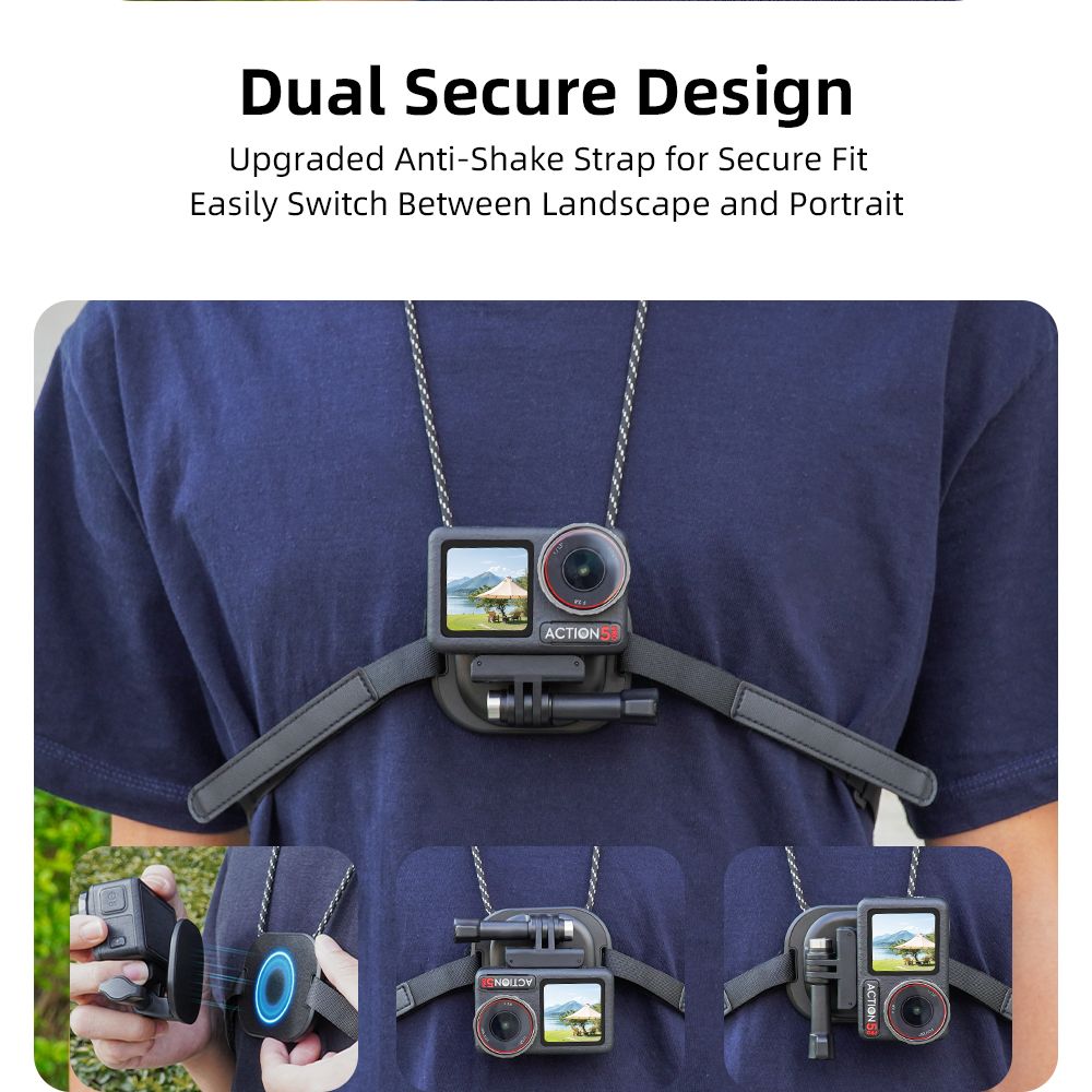 1.Magnetic neck mount with magnetic quick-release, freeing your hands; upgraded anti-shake strap reduces shaking in intense scenes.