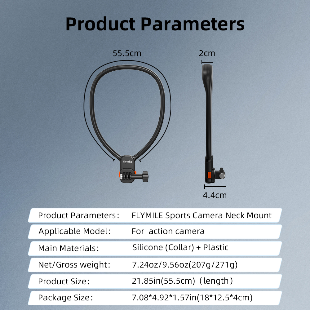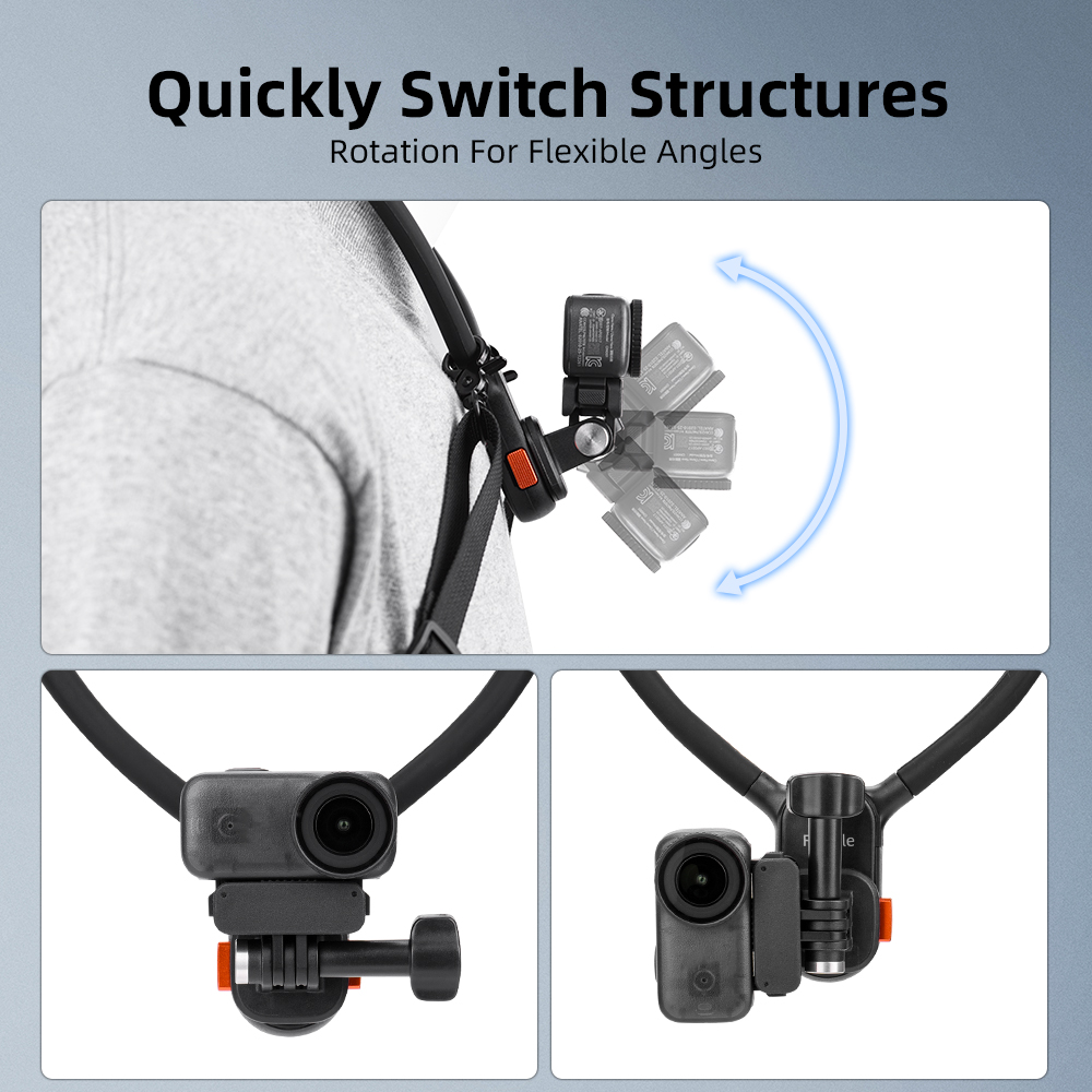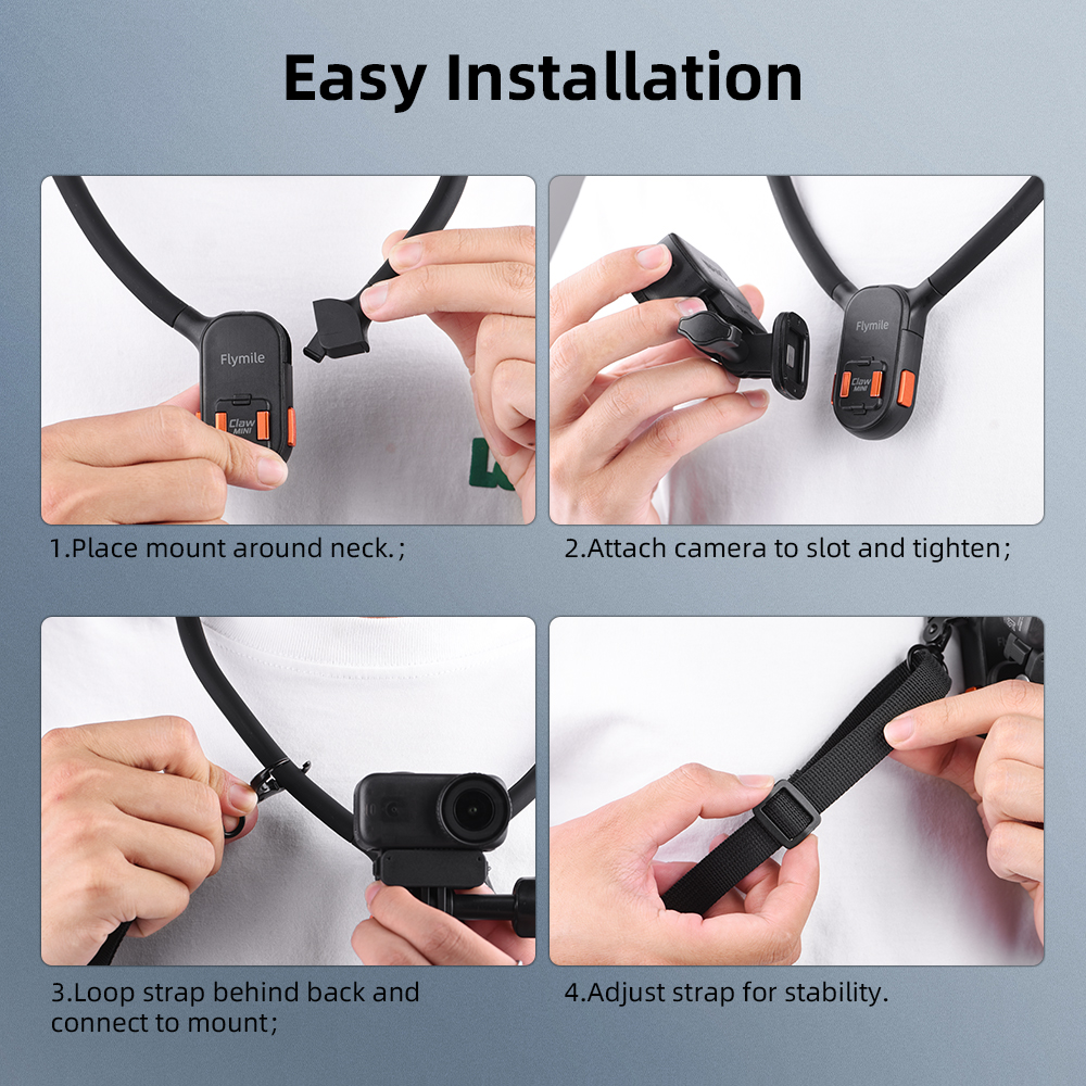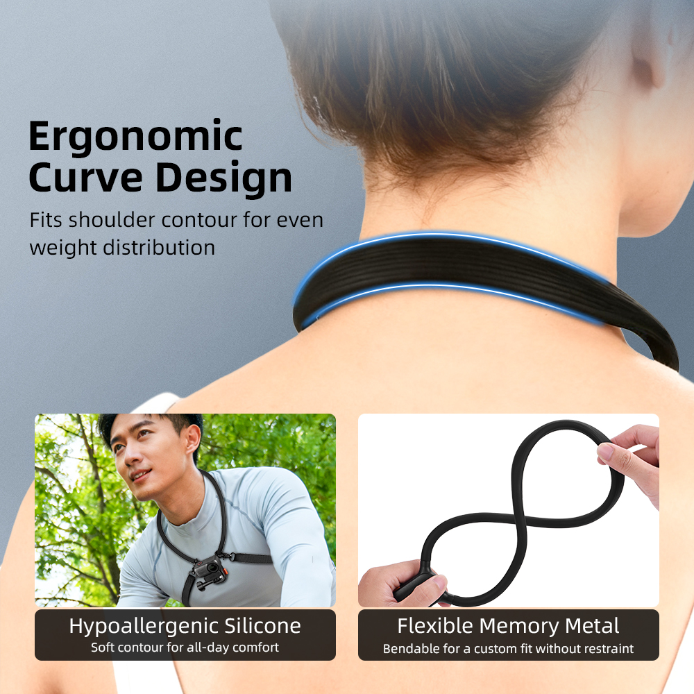 Unlock POV perspective for an immersive visual feast. The three-claw adapter can magnetically attach to the neck, compatible with various sports cameras and smartphones. The natural curve fits the shoulder and neck, ensuring comfort even during long wear. Equipped with a chest strap to ensure stable shooting during extreme sports like running, cycling, and skiing. The neck support is made of stainless steel and aluminum, allowing for flexible bending without breaking. Quick-release buckle installation; simply insert to complete, with a closed-loop lock to ensure secure wear without falling off. Portable and foldable for easy storage and carrying.