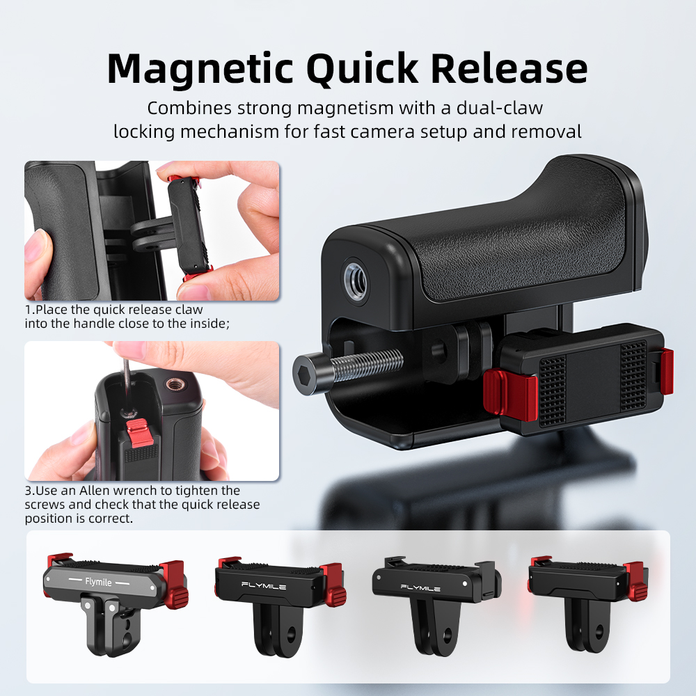 4、MAGNETIC QUICK RELEASE.Combines strong magnetism with a dual-claw locking mechanism for fast camera setup and removal.