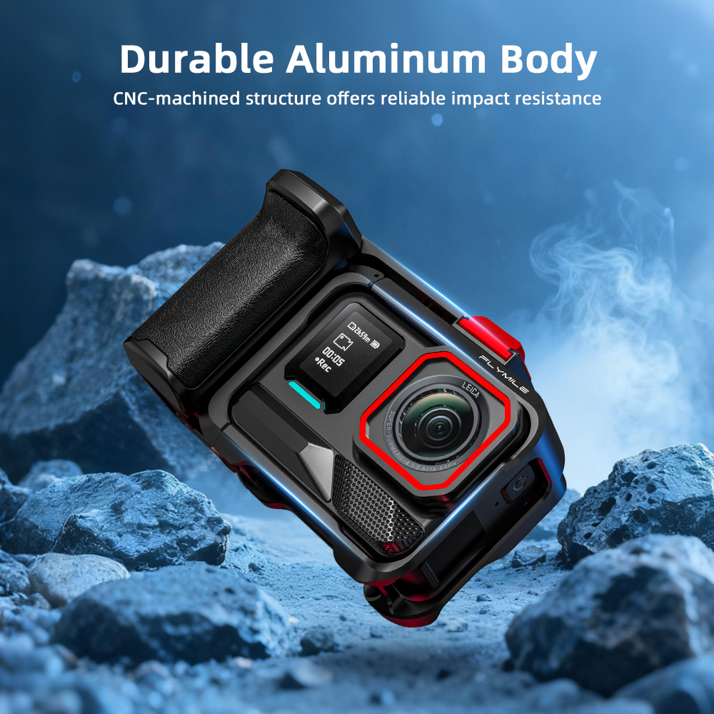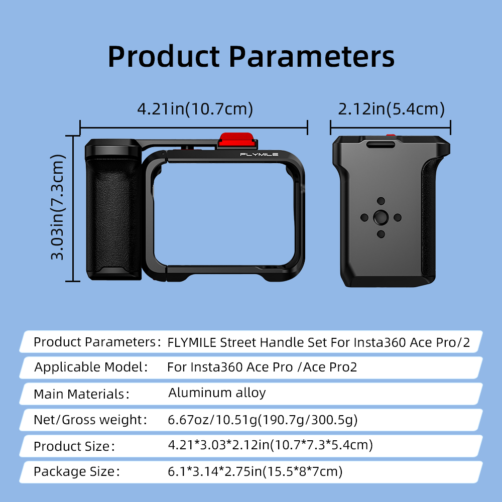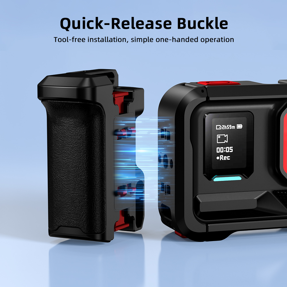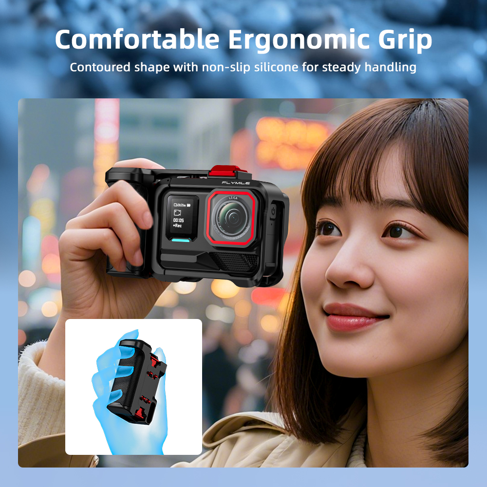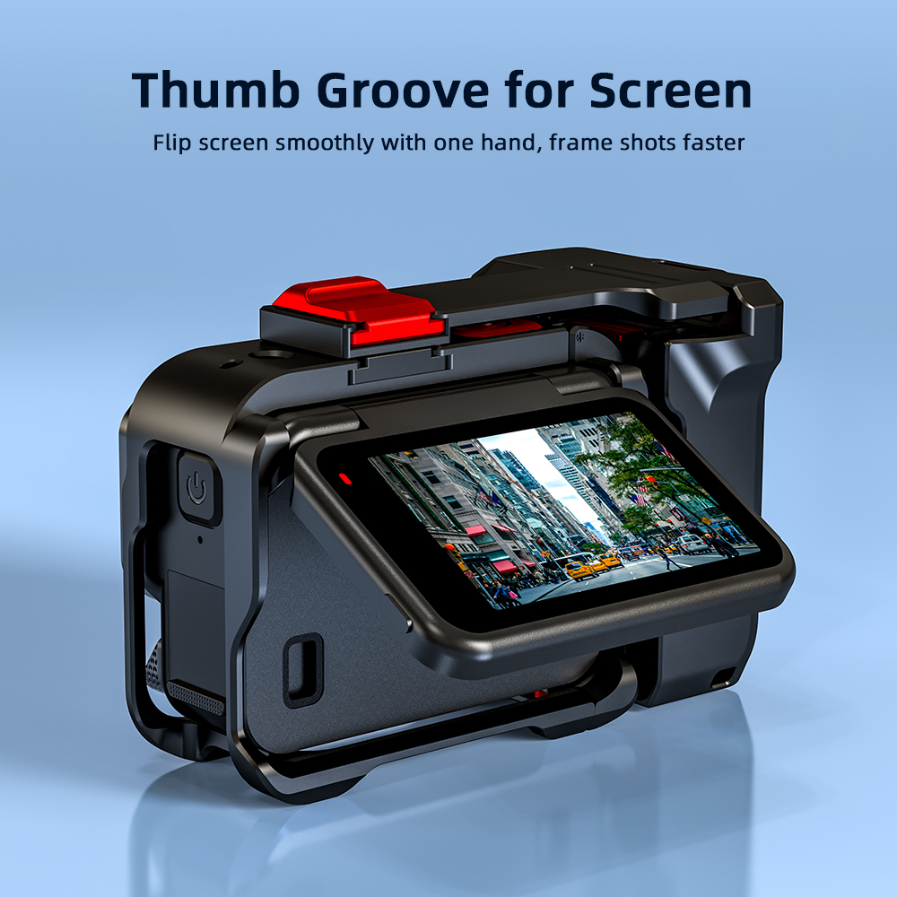 1、Aerospace Aluminum Shockproof alloy body, protects Ace Pro 2 in outdoor shoots. 2、Street Shooting Redefined Enhanced grip captures urban moments, inspires creativity. 3、Ergonomic Grip Control Non-slip silicone handle, reduces fatigue during long sessions. 4、Cold Shoe on Shutter Built-in cold shoe for mics/lights, expand creativity instantly. 5、1/4" Screw Base Connect tripods/gimbals for stable multi-angle filming. 6、Modular Cage Design Use cage alone or with grip, adapts to any scene. 7、Quick Battery Access Remove shutter part to swap batteries in seconds. 8、Thumb Groove for Screen Flip screen smoothly with one hand, frame shots faster. 9、Free Safety Wrist Strap Secure your camera for dynamic shots and low angles.