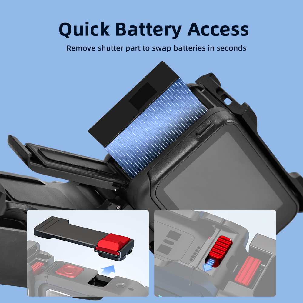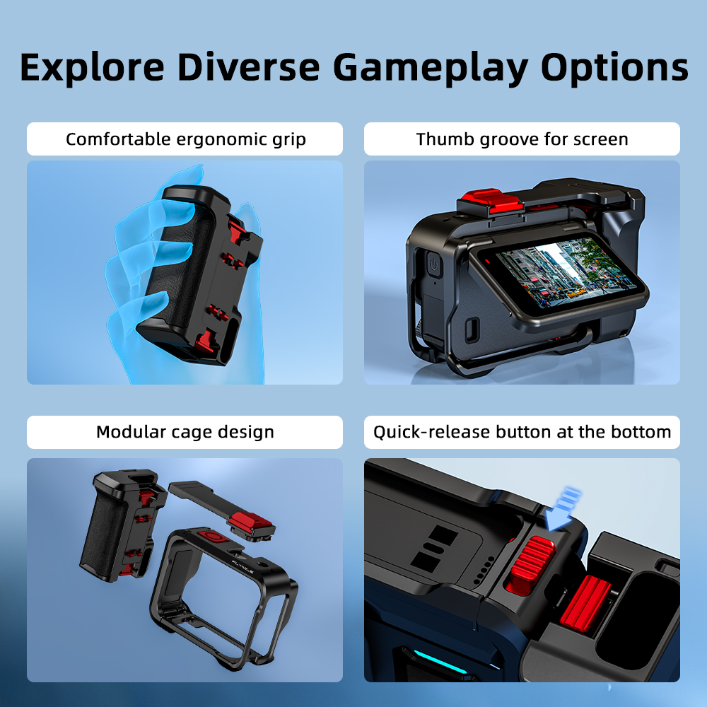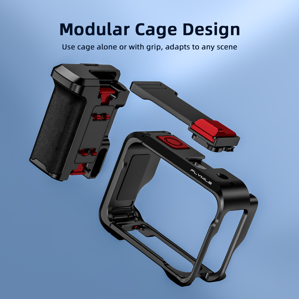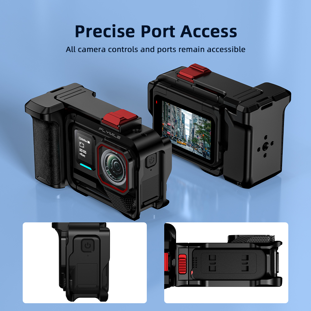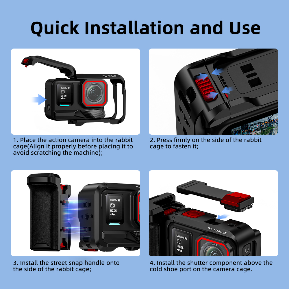 1、Aerospace Aluminum Shockproof alloy body, protects Ace Pro 2 in outdoor shoots. 2、Street Shooting Redefined Enhanced grip captures urban moments, inspires creativity. 3、Ergonomic Grip Control Non-slip silicone handle, reduces fatigue during long sessions. 4、Cold Shoe on Shutter Built-in cold shoe for mics/lights, expand creativity instantly. 5、1/4" Screw Base Connect tripods/gimbals for stable multi-angle filming. 6、Modular Cage Design Use cage alone or with grip, adapts to any scene. 7、Quick Battery Access Remove shutter part to swap batteries in seconds. 8、Thumb Groove for Screen Flip screen smoothly with one hand, frame shots faster. 9、Free Safety Wrist Strap Secure your camera for dynamic shots and low angles.
