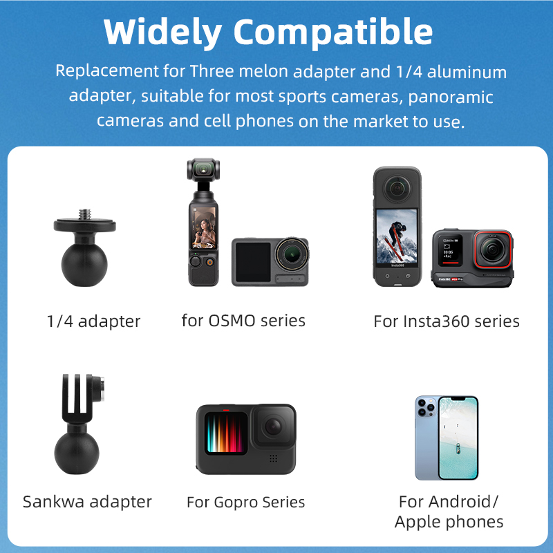 5. With two kinds of adapters, Three melon adapter and 1/4 adapter; Compatible with most of the sports cameras on the market, allowing more possibilities for creation,
