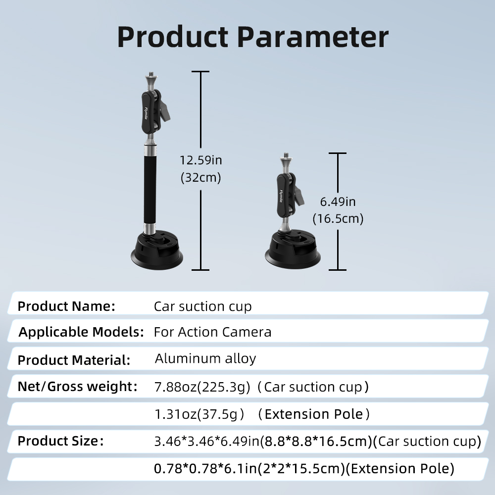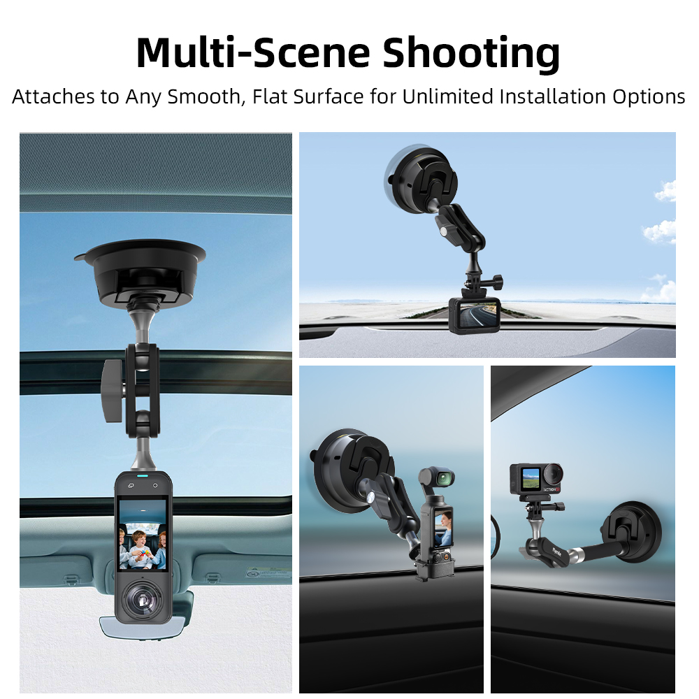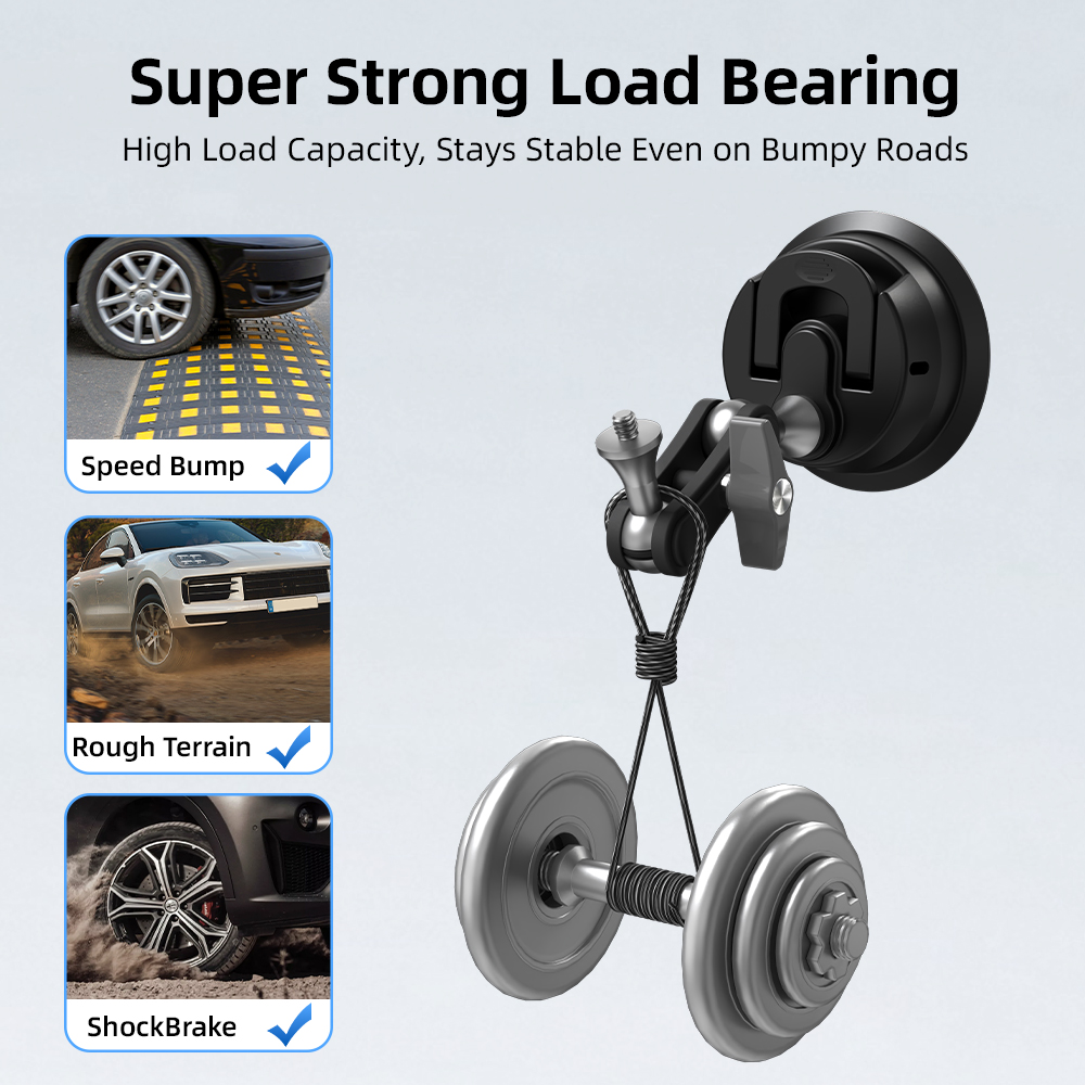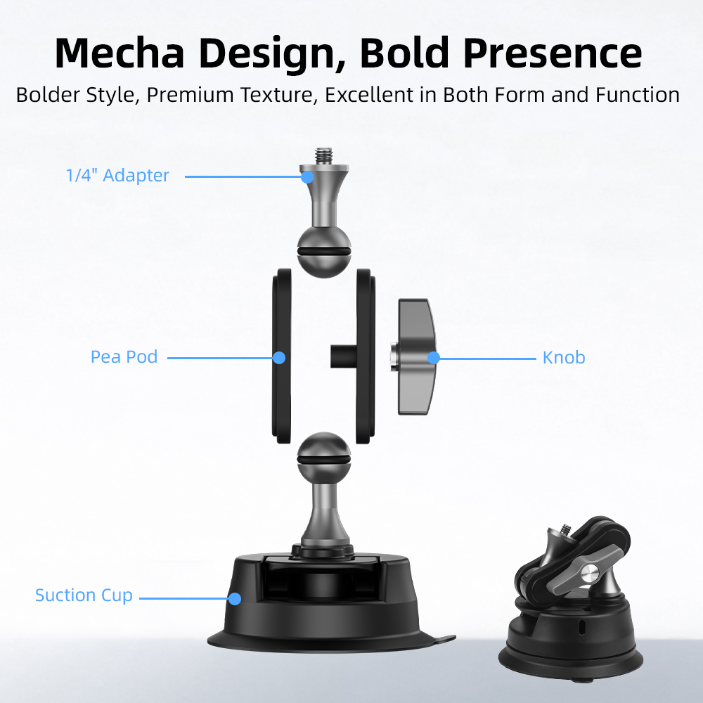 Mech-inspired design - bold and rugged, premium texture for excellence inside and out. Universal rotating head - shoot horizontal/vertical freely with 360° dual ball heads for flexible multi-angle adjustment. Super strong load-bearing - stays secure even on bumpy roads, no shaking or falling. Vacuum suction - press-to-lock mechanism expels air for a sealed vacuum grip. New aluminum alloy pole - shockproof and sturdy with anti-slip rubber pads for extra stability. Multi-scene shooting - mount on any smooth surface for unlimited installation options. Wide compatibility - fits various action cams, 360 cameras, and phone grips on the market. Washable and reusable - clean with water, dry thoroughly, and maintain strong suction after reuse.
