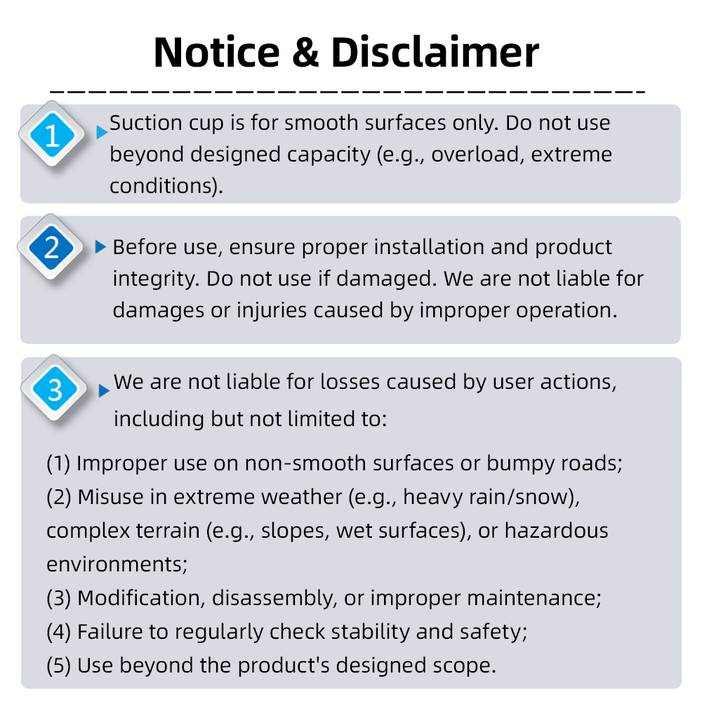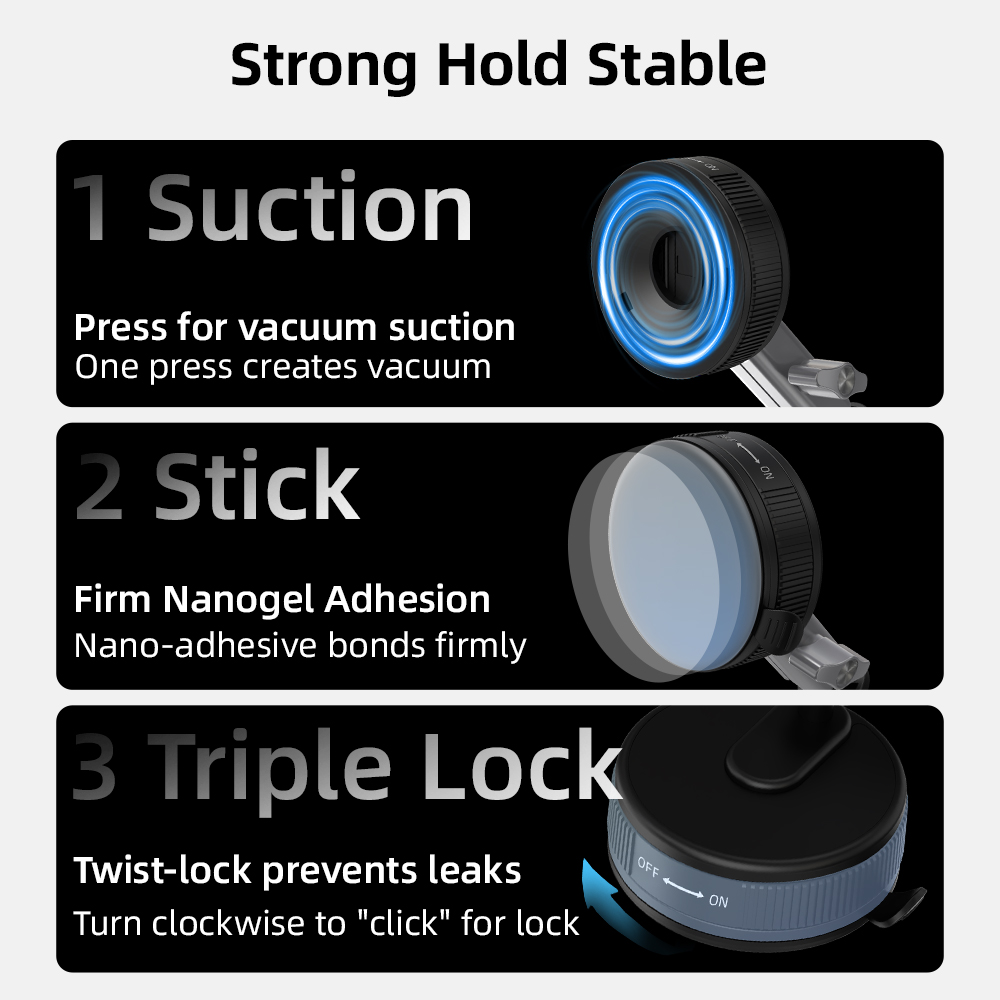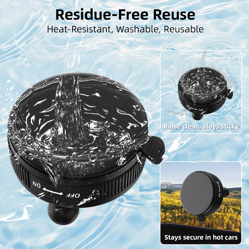 Features powerful adhesion and multi-level stabilization. Equipped with an upgraded nano-suction baseplate that securely adheres to various material surfaces. Utilizes high-temperature resistant nano-removable adhesive, allowing repeated washing and reuse without leaving residue, and is impervious to intense sun exposure.