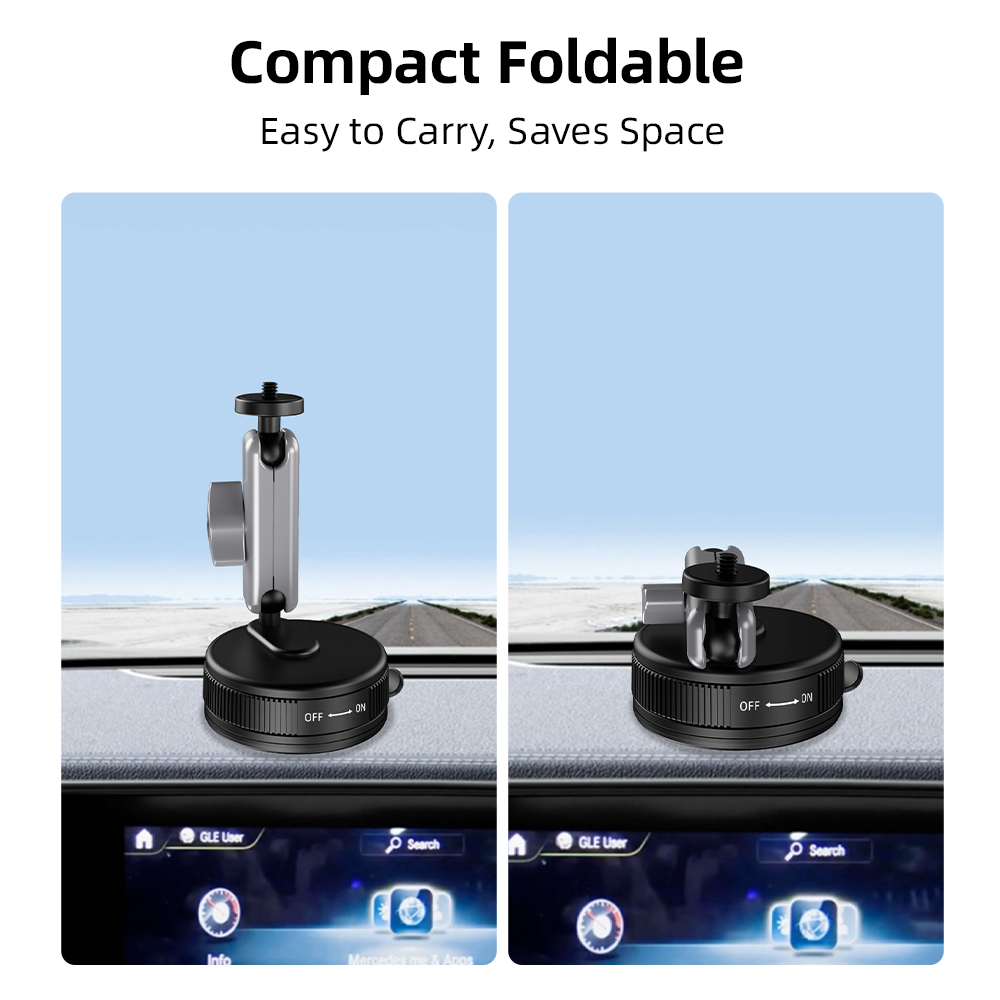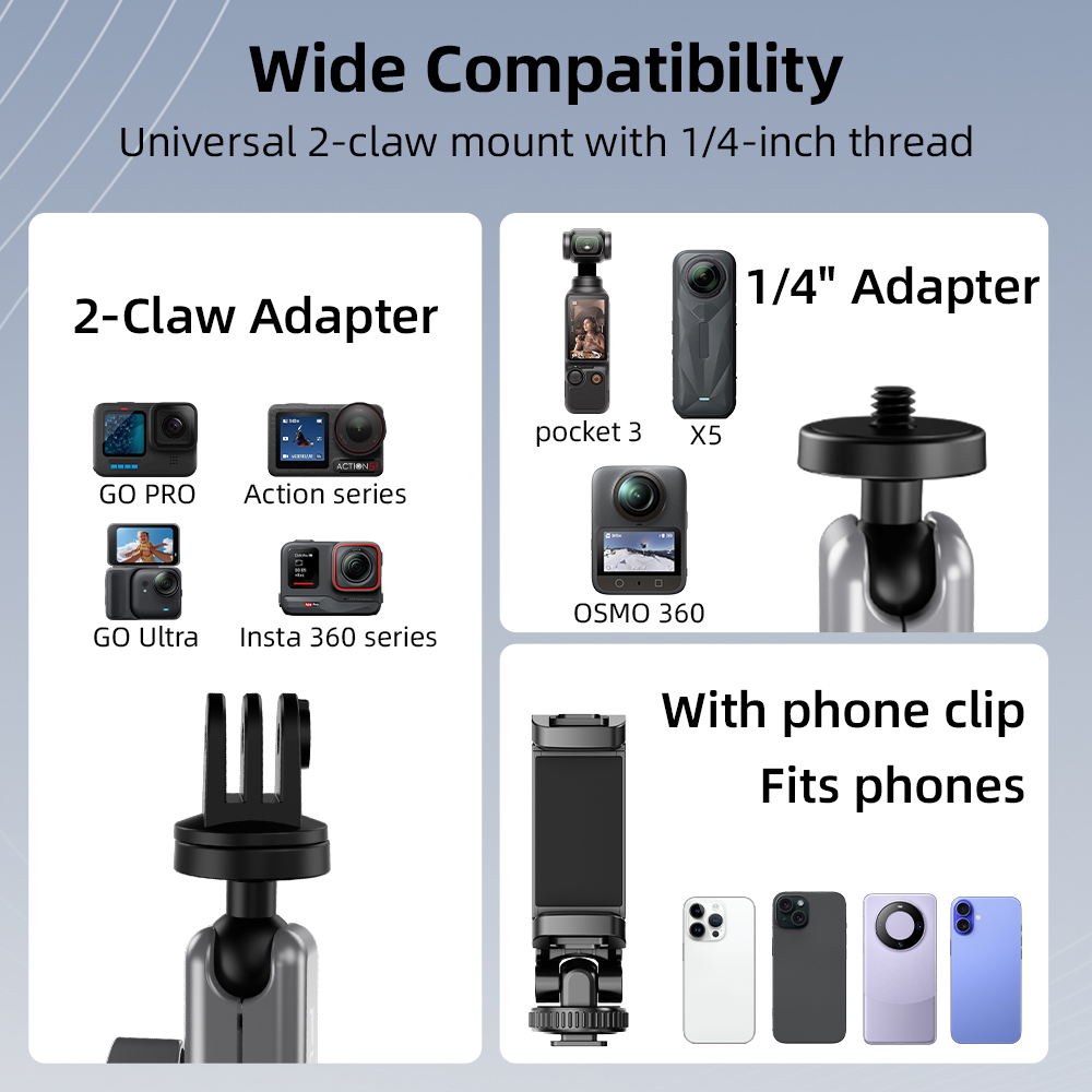 The entire unit is foldable, becoming compact and easy to carry when folded, reducing space occupation in vehicles and not obstructing the driver's view. Comes with a 1/4" thread and a two-claw interface, offering broad compatibility with action cameras and mobile phones.